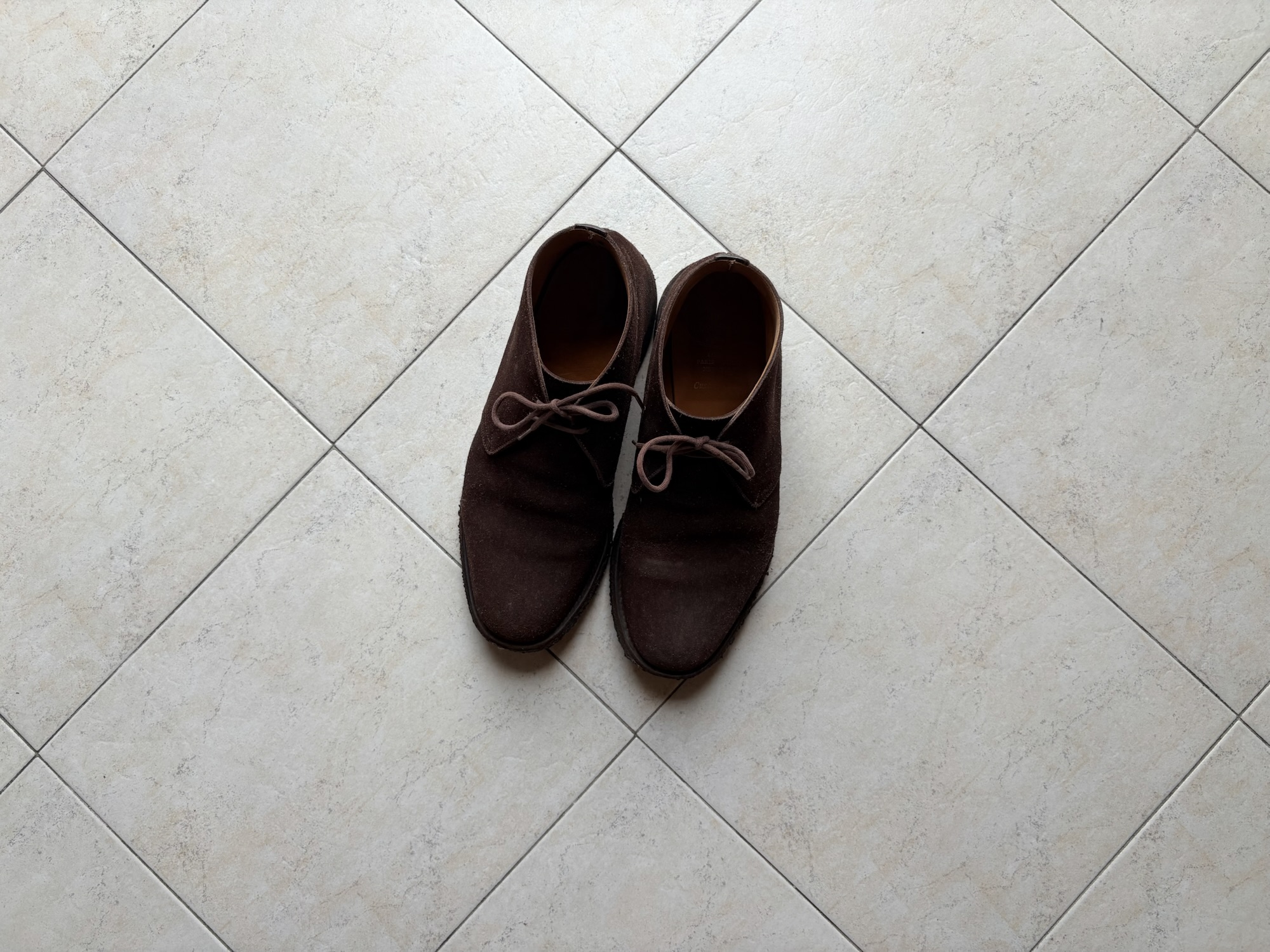 ただ、僕の場合多少フィッティングに問題はあれど、それでも歩きやすさはピカイチです。特に、イタリアは石畳の凸凹道だらけなので、レザーソールの薄っぺらい靴よりも、ライダーのように力強く分厚いクレープソールはクッション製がとても良いです。また、スエード素材ということもあり、僕のレパートリーの中では完全に雨靴としての機能を果たしています。もちろん、遠出をしなければならない時も、夏以外はこの靴を選びがちです。理由は至極単純で、比較的どんなスタイルにも合わせやすいのと、一日二日連続で履いても何とかなるという信頼のためです。ただ、クレープソールの劣化が凄まじいので、正直なところ、ソール交換する際は通常のラバーソールにしようか悩んでいる所です。