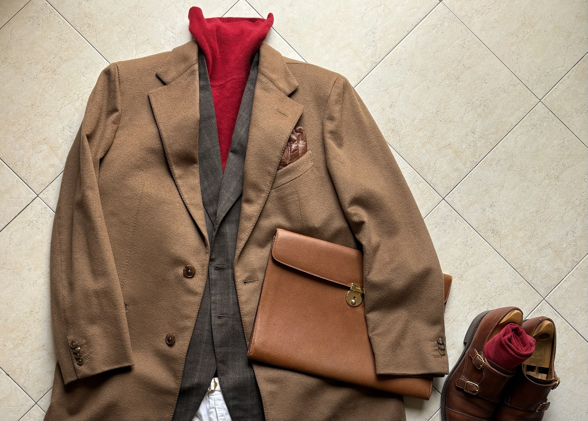3体目はよりカジュアルなキャメルのチェスターコートです。ダークブラウンのチェックジャケットと赤のタートルネック、白のコットントラウザーズと全体的に暖色で合わせており、リラックスしたムードが出ていると思います。サイドアジャスター、バッグ、靴のバックルの金具も金色で合わせているのもポイントです。