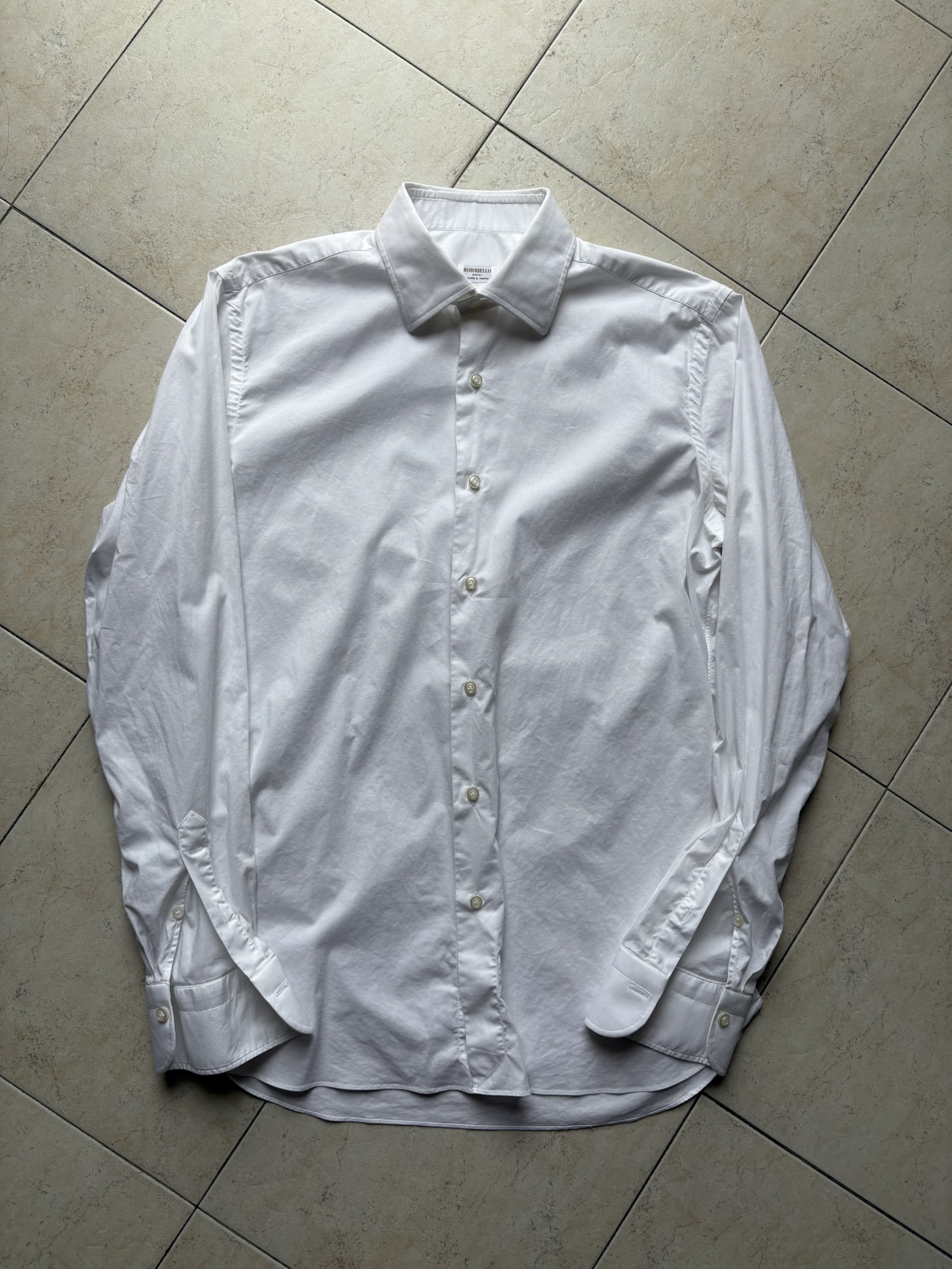 イタリア ナポリのシャツブランド ボリエッロの白のシャツ。無地のブロード記事で、普遍的なデザイン。