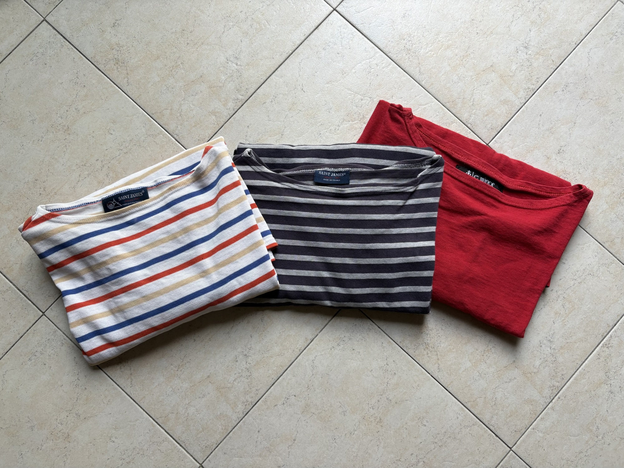 まず一つ目は、セントジェームズに代表される様なバスクシャツです。日本でおしゃれを名乗りたかったら「とりあえず1着はマスト」というくらいの定番品ですが、イタリアではなかなか見かけません。バスクシャツに限った話ではないのですが、イタリアではフランス由来のアイテムというのは大手メゾンのアイテムを除いて、あまり見かけない傾向にあると思います。イタリアはイギリスからの影響を強く受けている事もあり、少し寒いとはいえわざわざ似た様な環境であるフランスからの影響を、そこまで取り入れなくてもよかったのだと思います。この点が、なんでも取り入れようとする日本の多国籍さと大きく異なる点だと思います。ちなみに、本国フランスでは凱旋門の中のお土産屋にさえセントジェームズが売っています。