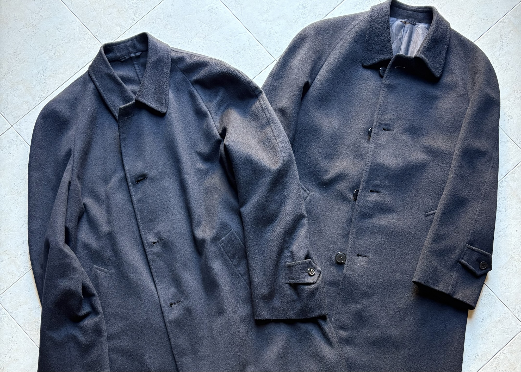 さて、こちらが今回比較に使う2着のコートになります。どちらも全く同じバルマカーンコートで色はネイビー、素材もカシミヤ100%となっています。唯一、裏地なしは少しオーバーサイズで、裏地付きはジャストと、サイズ感の違いがあります。まったく同じブランドの同じ形のコートだからこそ、比較としてより分かりやすくなるかと思います。