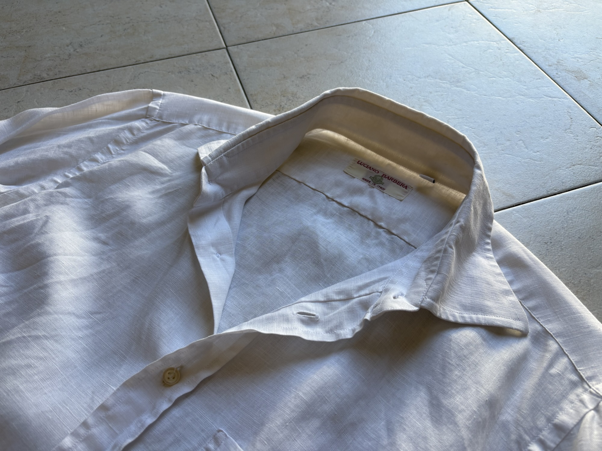 一方でBorrelliやBarbaのリネンシャツはどうでしょうか。これらのもつ独特な柔らかさは、ボタンを開けた瞬間から表情を大きく変えます。オックスフォードクロスに比べ生地が軽い分、胸元の開きが視覚的に強調され、より大胆な印象になります。個人的にはそれがリネンシャツの最大の魅力だとおもっています。肌に直接触れる涼しさ、光を透かす繊細な表情。それを活かすには、むしろ開けた方がいい。ボレッリの細かいステッチや美しい衿の仕立ては、開けることで初めてその全貌が見えてきます。